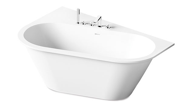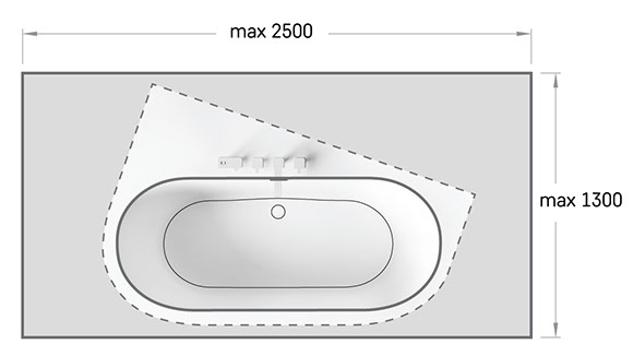 DECO SHAPE vanna - piemērs, noapaļoti 2 stūri, slīpa virsma, iegriezti jaucējkrāni uz virsmas